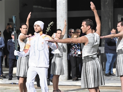 11月26日,第一棒火炬手、希腊运动员彼得罗斯(前左)传递火炬。