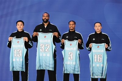 11月28日,新加盟的球员林韦恺(左一)、汤普森(左二)、约瑟夫·杨(右二)和王奕博在出征仪式上展示球衣。