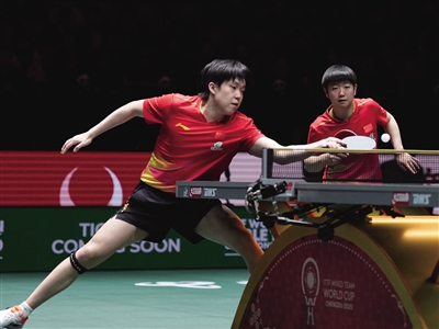 12月6日,中国队组合孙颖莎/王楚钦(左)在比赛中。最终,他们在混双比赛中3∶0战胜日本队组合户上隼辅/张本美和。