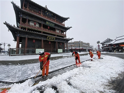 环卫工人清理古城内道路积雪 杨昱郁 摄
