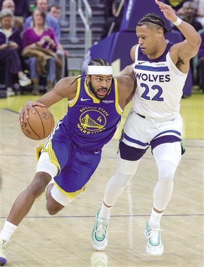 图为勇士队球员穆迪(左)在比赛中突破森林狼队球员杰伦·克拉克的防守。 新华社发