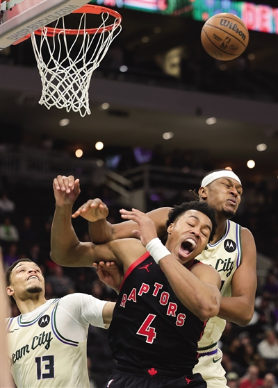 12月18日,在2025-2026赛季NBA常规赛中,多伦多猛龙队客场111∶105战胜密尔沃基雄鹿队。图为雄鹿队球员特纳(右)与猛龙队球员巴恩斯(中)在比赛中争抢篮板球。