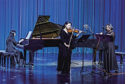 音乐会在钢琴三重奏《d 小调协奏曲》庄重典雅的旋律中拉开帷幕。随后,钢琴独奏《婚礼进行曲》、双钢琴《桃花红杏花白》、钢琴四手联弹《绣荷包》等曲目接连登场,旋律或明快悠扬、或质朴灵动、或含蓄温婉,让观众沉浸其中、如痴如醉。