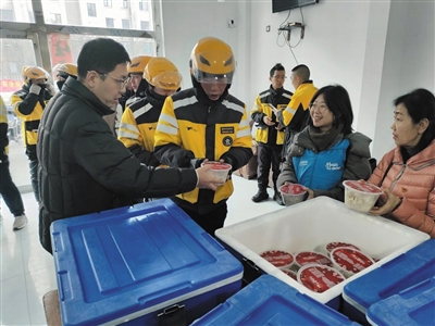 上午8时30分,参与活动的多家爱心饭店一派忙碌景象。后厨里,厨师们动作利落地把前一天加班包好的饺子下锅,煮熟后整齐码放在保温餐盒里。负责配送的网约车司机陆续抵达各取餐点,有条不紊地完成取餐、清点、装车等流程后,驱车奔赴全市25个青春驿站、外卖站点、快递分拨中心。另一边,80余名工作人员提前分赴慰问点,配送车抵达后,他们将热腾腾的饺子分发给快递员、外卖骑手和网约车司机,现场欢声笑语不断,寒意被浓浓的暖意驱散。