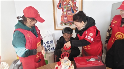 本报讯 (记者 杨昱郁) 12月20日,冬日暖阳洒满阳高县大白登镇赵家寨村,市退役军人志愿者协会老兵公益志愿服务队的志愿者们带着满满的心意,为烈士后代李存老人庆祝95岁生日。