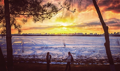 24日傍晚,文瀛湖风景区冰封的湖面倒映着霞光,橘红暖光与素白积雪交相辉映,构成一幅冷暖交织的美丽画卷。市民漫步湖畔,与自然和谐共处,享受宁静与美好。
