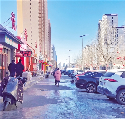 本报讯 (记者 龙中华) 12月30日,有市民向本报热线反映,平城区仁爱街的御东花卉水族生鲜市场北侧部分商户门前路面结冰,给过往行人带来极大不便,呼吁有关部门督促商家尽快清理。