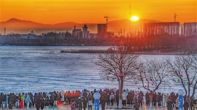 2026年元旦清晨,大同文瀛湖银装素裹,封冻的湖面在晨光中熠熠生辉。尽管寒气袭人,但仍有数百名游客与市民早早汇聚于湖畔,共同迎接新年第一缕阳光。当金色的曙光划破天际,洒向这片冰雪世界时,现场顿时响起阵阵欢呼。人们在这冰封的湖景中定格美好瞬间,许下对2026年的诚挚愿望,以温暖与期盼开启充满希望的新征程。 本报记者 张占兵 摄