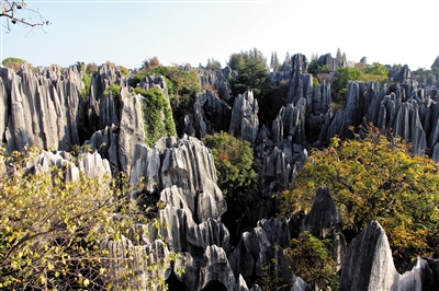 石林景区位于滇东,距昆明70公里,是国家5A级景区。快到景区时,但见公路两侧山峰奇异,奇石如林,如峰,如人,如兽,如战场,如林海,如波涛,绝无两处相同的景致。此前,我看过一些喀斯特地貌景观,比如溶洞。石林也属喀斯特地貌,但溶洞是地下景观,而石林则是地上的,一览无余,比溶洞更直观。