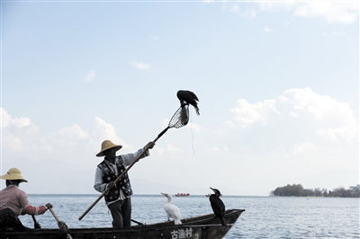 湖面上,船只忙碌地往来着,有能乘坐几百人的大船,也有一个人划动的小舟,而最吸引人的是鱼鹰表演。鱼鹰又称鸬鹚,渔民们把它驯化后,成了专门的捕鱼工具。为了鼓励鱼鹰下水抓鱼,渔民先是给它们抛上一只小鱼作为鼓励,然后把它们赶下水。它们借助着敏锐的双目和锋利的爪子很快就抓到了活蹦乱跳的鱼儿,立时引来了游客的欢呼声、鼓掌声和相机的快门声。为了表彰“功臣”,渔民就赐给它一条小鱼作为奖赏。