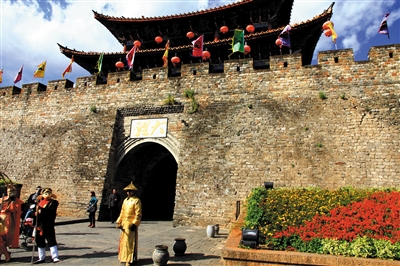 大理的“风花雪月”——“下关风,上关花,苍山雪,洱海月”曾在我的脑海里一幕幕地构想着,一次次地美好着。因而,车一到大理,我便迫不及待地直奔大理古城而去。大理古城始建于明洪武十五年(1382),城池四周有城墙,东、西、南、北各设一城门,城门上建有城楼,古城墙于解放初期拆毁。现在的南门,是大理古城对外接待的“窗口”,十分热闹。南门为1982年重建,门楼上,金色的“大理”二字在阳光下分外醒目,据说为郭沫若先生所题。大多数游客都未能免俗,必在此处拍一些“到此一游”的照片后匆匆作别。