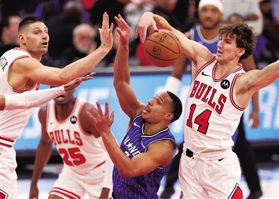 1月2日,在2025-2026赛季NBA常规赛中,芝加哥公牛队主场121∶114战胜奥兰多魔术队。魔术队球员贝恩(中)在比赛中进攻受阻。