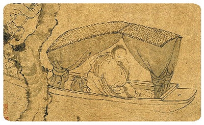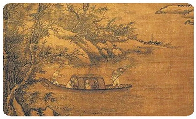 张渥的《雪夜访戴图》现藏于上海博物馆。该作全幅构图简洁,主题突出,与其他“访戴图”不同的是:画面舍弃了雪景、山水的渲染,主体部分仅留一树、一舟与一人而已。河岸古树枝干虬劲,或浓墨渲染,或淡墨勾勒,营造出冬夜寒寂的意境。作者集中笔墨描绘王徽之的人物形象,造型准确,仅寥寥数笔,将人物刻画得惟妙惟肖。王徽之坐于船篷内袖手读书,人物在眉目之间显露高傲与郁郁不欢之态。作品沿用李公麟白描传统,人物衣纹以细劲铁线描勾勒,树石线条富于粗细浓淡变化,通过人物神态与环境的对比烘托出隐逸之士的情怀。从整体的气氛到苍劲的古树、形单影只的小舟,再到形态迥异的撑篙人和读书者,毫无违和之感。画面有意侧重描绘主人翁双手拢袖,一株脱尽树叶的寒木,船夫以袖裹篙撑船行进,以衬托雪夜寒意的情景。该作表现出画家高超的笔墨技巧和深厚的艺术功底,实为他生平倾心之作。
