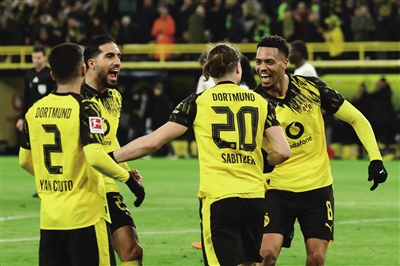 1月13日,在2025-2026赛季德国足球甲级联赛第17轮比赛中,多特蒙德队主场3∶0战胜云达不来梅队。图为多特蒙德队球员庆祝得分。