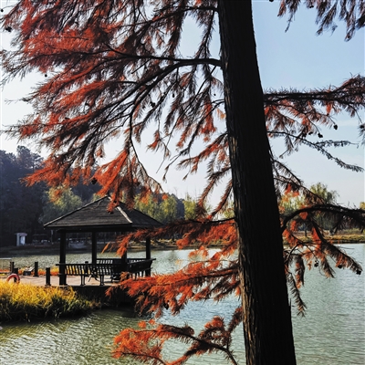 此地是江苏省最大的生态森林,占地2000亩的水域中,有红杉林1050亩,10万多株杉树高大挺拔、气宇轩昂,一行行、一排排齐刷刷立于水中田字格间,或者干脆站在水中,栉风沐雨,冰刀霜剑,它们仍战士般齐心协力,直插云天。春来一身苍翠,夏季浓荫清凉,深秋时树叶变黄,几场浓霜过后,枝叶从碧绿向嫩黄、铬黄、锈黄渐渐着色,直到11月至次年1月,经霜后的杉林完全摒弃绿色,凤凰涅槃似的让一场场严霜染出古铜、赭石、啡色、浅红、绯红、酡红,还有橙红、棕红、绛红、焦红,万千暖红揉碎在枝头,一树树的美拉德色系,亮丽、热烈,沉静又典雅,静立于蓝天下碧水上,无声吟咏着植物界的暑往寒来、流年似水,为游客捧出一场醉人的视觉盛宴。