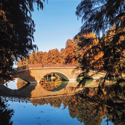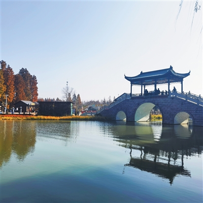 红杉林中水网纵横,自然有桥,平桥、拱桥、铁索桥皆有,三步两桥随处可见。桥下有舟楫,桥上是游客,林中是红杉,林下有游鱼。高大的杉树上还有鸟窝,头一抬便见喜鹊、鹭鸶、草鹦鹉之类从枝头飞过,累了乏了就旁若无人地在那里唱歌,呼朋引伴。那些站立水中的池杉和落羽杉,活像燃烧在水上的硕大火炬,通过曲曲折折的木栈道连接在一起,任你自在行走。不想走了,坐在身边的凉亭里,休憩,闲聊,阳光从林间泻下,打在人身上,仿佛被镀上一层暖融融的红晕,心境顿时豁然。兴致勃勃地看一群锦鲤冲你游来,游过栈桥,尾巴一甩又远了。调皮的孩子赶紧去追,正倚了树身拍照的情侣连声提醒注意安全。这一幕摄入镜头,更多了几分生机与暖意。