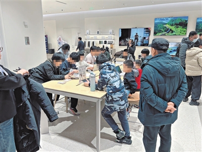 不仅是国瑞购物中心,在惠多港购物中心、龙湖北苑天街、华联常营购物中心的手机店里,都能看到不少玩手机的孩子。这些购物中心都有多家手机店,但孩子们往往都聚集在距离商场门口较近、面积较大的那几家。相比于手机,孩子也更倾向于玩屏幕更大的平板电脑。