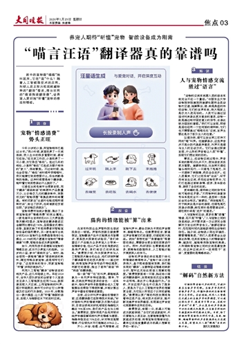 动物的声音表达存在高度个体化和情境依赖等特点。“宠物个体之间差异很大,基于现有数据库资源,我们能实现的‘翻译’,主要停留在情感的映射分析,暂时还无法达到语义理解的程度。”黄赟贺家里有一只猫,她在给小猫试用翻译器时,发现有效的反应主要集中在呼唤、表达开心等基础行为。“当然,开发这项产品也不仅是为了服务人,更是为了让人工智能对世界的理解更全面,为它加入听觉这个认知的新维度。”黄赟贺从更广阔的科技发展视角看待这类产品,相关技术的研发,能不断完善声学世界模型,实现通过声音变化预测事件走向的目标。