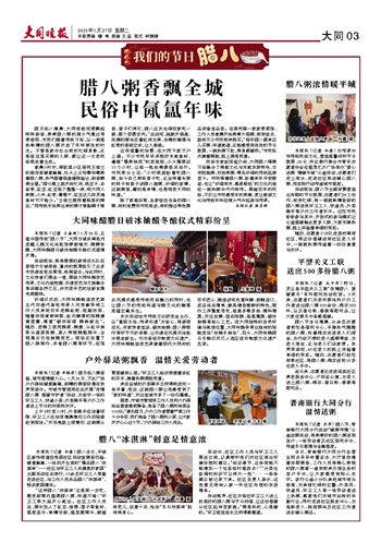 这样温馨的场景,在大同千家万户上演。不少市民早早采购好本地食材,遵循“慢熬细炖”的老规矩,小火慢煨近10个小时,让每一粒杂粮都吸足汤汁。市民李女士说:“小时候就盼着吃腊八粥,如今自己熬给孩子吃,还会学着长辈的样子给孩子讲腊八施粥、祈福的故事,这碗粥里,藏的是亲情,也是咱老大同的味道。”