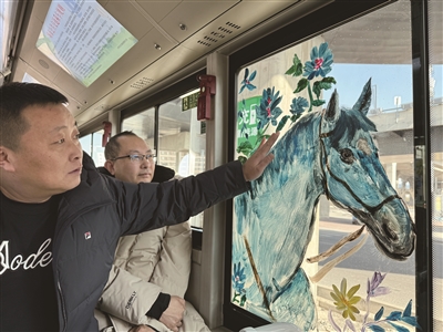走进主题车厢,浓浓的年味扑面而来。车窗上,一幅幅灵动的彩绘骏马格外吸睛。“这次车厢焕新主要围绕马年生肖绘画为核心,在全线路14台车上打造了风格不同的彩绘骏马‘年味车厢’。”据该公司相关负责人介绍,这些线条灵动、色彩鲜艳的骏马图案,由一名职工家属用3天时间绘制而成,有的复刻汉代铜奔马矫健姿态,搭配祥云寓意“马到成功”;有的勾勒亲子骏马图景,传递团圆期许,将传统生肖文化与公交出行场景巧妙融合。