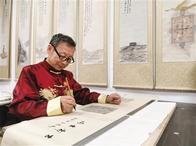 2008年8月,他有幸到中央美院城市设计学院进修学习,得到京城多位名师指点,古建筑绘画技艺日臻成熟。为系统学习大同历史,他从图书馆借来明朝张钦版《大同府志》,耗时六年用毛笔手抄完24万字全文,让他对古都文脉有了更深刻领悟。2014年,他开始全身心投入大同历史文化书画创作,至今完成上百万字相关创作,其作品因融注鲜明大同元素、写实接地气的风格,被业界誉为“不可多得的艺术珍品”。