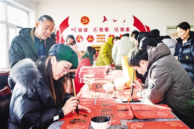 活动现场,志愿者们不停为往来人群添粥递菜,一位快递小哥捧着碗,呵着白气感慨:“这粥真香,暖到心里去了!”党群服务中心,红纸铺展开来,书法老师们凝神挥毫,笔锋流转间,“平安如意年年好”等吉祥春联跃然纸上,饱满的“福”字刚一落笔,便引来村民围观点赞,大家争相挑选,将手写祝福捧回家中。