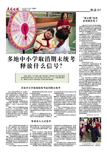 ~~~近期,成都、广州、青岛、厦门等地宣布,取消非毕业年级区域性或跨校际期末统考,改由学校自主组织评价。这一现象意味着什么?释放什么信号?“新华视点”记者走访多地调研。
