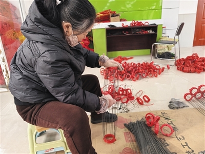 “这道工序是打底座,每一个动作都要做标准,一步到位,钩儿要弯平,否则会勾坏灯笼布。制作一个传统灯笼有打底座、扎龙骨、套绸布、拉金线、装灯穗等八九道工序,每道工序都要把细节做好,这样才能确保每一个灯笼的品质。”村妇联主任王秀萍一边手拿钳子认真地弯着手里的铁丝,一边向记者详细介绍着制作灯笼的工序。