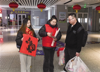 本报讯 (记者 辛雅君) 昨日,市公交七分公司联合公安、交管部门及青年志愿者,在大同综合客运中心开展迎新春送祝福活动,把手写“福”字、定制导乘图与马年贺卡送到归乡旅客手中。