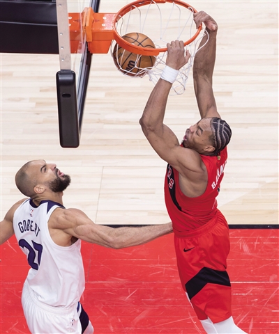 当地时间2月4日,在2025-2026赛季NBA常规赛中,多伦多猛龙队主场126∶128不敌明尼苏达森林狼。图为猛龙队球员巴恩斯(右)在比赛中扣篮。 新华社发