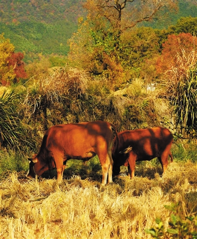 你瞧,那许许多多的乌桕树,枝柯纵横,满树都是艳艳的赤彤朱丹,远处又有黄的叶,绿的田野,翠的竹,半枯的野草,洁白的荻花,路边却走着牵牛的汉子,地里还有种菜的老妇,而那三三两两的游客,红衣绿衫,也成了画中的风景,在金色的阳光下,人与自然多么和谐,随便哪个角度切入,你就美美地欣赏吧。