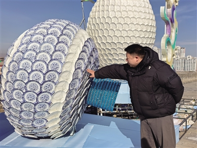 行至东城墙,一抹“北魏蓝”更是惊艳无比。只见一组组取材于大同文物的彩灯由一个个晶莹剔透的小玻璃瓶组成,每个瓶子用细铁丝捆扎,不仅密不透风,而且瓶中药水配比与色彩也极具考究。采用瓷器捆扎技艺制作而成的灯组,更是通过棉线对1个盘子的4个角进行固定,然后像龙鳞一样依次拼接扎合,不仅密而不垮,而且极具韵味。届时,观众不仅能近距离感受到丝绸的质感、瓷器的玲珑,还能感受文化传承的意义。