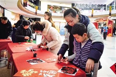 2月6日,平城区清远街道在百盛云中店举办迎春送福文化活动,工作人员与居民共同写春联、拓“福”字。