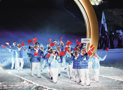 中国体育代表团共286人,其中运动员126人,将参加7个大项、15个分项、91个小项的角逐,创下中国冬奥会境外参赛项目最多、运动员规模最大的新纪录。开幕式上,速度滑冰运动员宁忠岩和短道速滑运动员张楚桐共同担任中国代表团旗手,引领队伍入场。