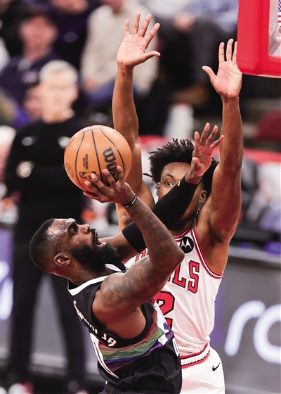 当地时间2月7日,在2025-2026赛季NBA常规赛中,丹佛掘金队客场136∶120战胜芝加哥公牛队。图为掘金队球员小哈达威(左)在比赛中上篮。 新华社发