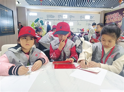 观摩环节结束后,活动进入了充满温情的实践部分。每位小记者都领取了一张明信片,俯身认真书写,将下午的所见所感化作真挚的祝福。一位小记者工工整整地写给在北京的哥哥:“哥哥,今天我看到了好多珍贵的邮票,还见到了获奖的老师。我也给你寄一张明信片,祝你马年快乐!”身旁的妈妈轻声提醒着书写格式,鼓励她完成这封颇具仪式感的信件。书写完毕,小记者们依次将明信片现场投入邮筒,完成了一次传统而完整的情感传递。