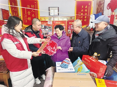 活动现场,志愿者们提着米、面、油等生活物品,一进门就忙前忙后,帮老人张贴大红春联,屋里屋外顿时洋溢着喜庆的年味。大家围坐在老人身旁,与她促膝交谈、嘘寒问暖,细心询问老人的日常起居、身体状况和生活需求,叮嘱老人注意保暖、安心过节,一句句贴心话语让老人备感温暖。
