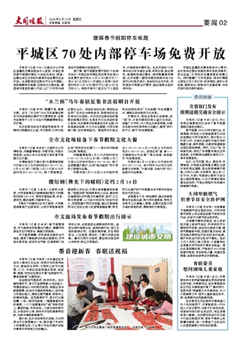 市博物馆及下辖分馆(北朝博物馆暂不开放)2月15日开放时间为9∶00—17∶00,2月16日(周一)闭馆,2月17日至23日开放时间为8∶00—18∶00。除了常规展览,还有“我所思兮在雁门——晋北汉代物质文化展”等展览。
