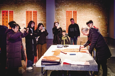 展览中特别展出了由市民、网友共创的《万马奔腾》书法装置艺术作品,这幅作品汇聚了市民、网友书写的百余个“马”字,字体各异、意趣纷呈,一笔一画间,既承载汉字的千年底蕴,又彰显马年的昂扬气象,更饱含全民参与的质朴温情,是古都大同新春里一道独特的文化风景。该作品以创新的互动形式拉近大众与传统文化的距离,让观展更具参与感与趣味性。开幕当日,现场还同步举办了送春联、赠“福”字、木版年画拓印等公益文化活动。