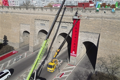 14日,大同古城城门陆续开始悬挂巨幅春联,为2026马年新春增添浓厚年味与喜庆氛围。