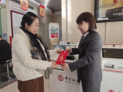 “考虑到节前兑换新钞的人比较多,我们优化了办理流程,减少市民等候时间。”李俊艳说,支行还为兑换新钞的市民准备了印有吉祥喜庆的图案和祝福话语的新春红包,让市民在兑换新钞的同时收获一份新春喜悦,把福气和好运带回家。