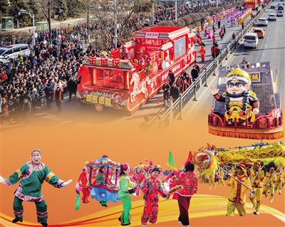 2月25日农历正月初九,平城区迎宾街热闹非凡,舞龙舞狮、花车巡游、秧歌、旱船、挠阁等民俗表演轮番上演,吸引众多市民游客驻足观看。