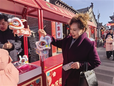 在柴市角街的供销年货大集上,各个摊位前同样人气爆棚,炸花糕、铜器、剪纸、布老虎等手作琳琅满目,引得游客频频驻足。“小时候逛庙会,总缠着大人买布老虎、糖画,如今这些老手艺能在大集上看到,还能让年轻人学,特别好。”刘红凤感慨,这些老物件不仅是儿时玩具,更是大同的文化根脉。