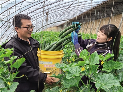 图为东小村镇东小村神泉蜜种植基地农技员闫玉荣和丈夫采摘鲜嫩黄瓜。 孙展春 摄