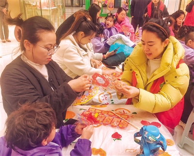 为了烘托元宵节氛围,文艺表演结束后开展了亲子花灯制作活动,家长与孩子携手协作、默契配合,拼框架、绘图案,交流互动中欢声笑语不断。