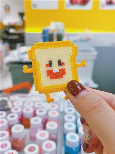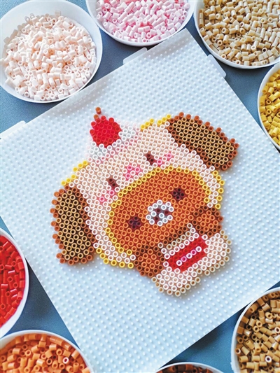 拼豆,即将五颜六色的“塑料豆”拼成图案,加热熔化之后豆与豆之间相互连接,变成平面装饰物。据李可介绍,拼豆不难,“烫豆”(热压定型)难,不少新手动手即“翻车”,能帮忙烫豆的线下手作店成为了她们的目的地。