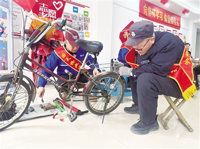 近日,平城区柳港园东院社区联合物业工作人员在社区一楼大厅为居民提供免费理发、修理自行车、磨菜刀等服务,赢得居民好评。 本报记者 杨翠叶