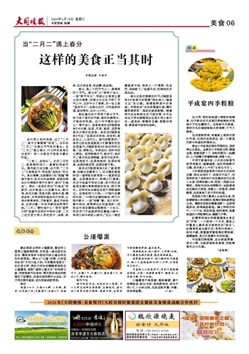 在大同人的风俗里,过了“二月二”,春节才算圆满“收官”。马年的“二月二”与春分节气恰好重合。当“二月二”遇上春分,什么样的美食正当其时?放一分春色于美食中最合时宜。
