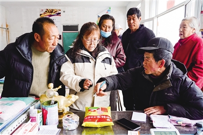 图为农户在购买种子、化肥。