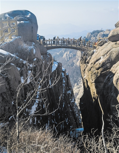 “泰山虽云高,不如东海崂”,崂山7大景区中,最难攀登的就是海拔1033米的第二高峰灵旗峰,当然要挑战。乘上景区巴士,绕山道左弯右旋至“天地淳和”广场,淡黄的阳光升上来,四面皆青山,崔嵬峭拔,令人惊叹。抬脚往上,只顾攀爬,山风清冷,触目寒凉,道旁林间时不时现出些怪石、奇树、古建遗迹,还有猴与野猫在岩石间出没,并不怕人。到巨峰区八卦门环线之“离门”时,身上竟出了细汗。头一抬便看到40多米高的一块巨石“自然碑”,再往前还有“朱雀石”,恰如一只大鸟,栩栩如生。沿顺时针往“坤门”而行,上下起伏爬了一程,发现背阴处的岩石上竟积了雪,越往上爬,积雪越厚,却见前方悬崖顶上竖有一大一小两块“望海”石,目之所及,云雾缭绕间真是大海。如此众多的象形石如跃龙石、比高崮、五指峰、高僧禅坐、僧侣拜佛等等,时不时会出现在八卦门环线间,崂山竟还是一座天然的雕塑园,让一路攀爬添了更多乐趣。想想方圆446平方公里的崂山山体全由花岗岩构成,亿万年的自然雕琢,大自然的鬼斧神工,能形成许多惟妙惟肖、令人遐思的象形石,更诠释了大自然的神秘与奇谲。